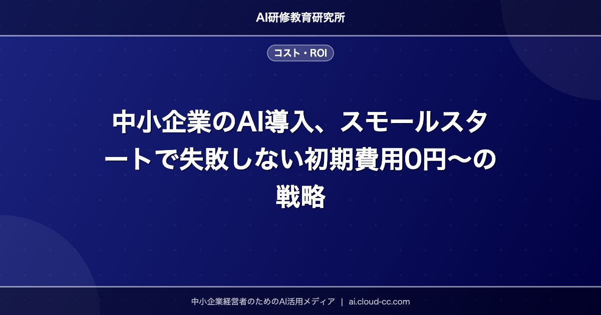 「AIを導入したいが、費用が心配」「どこから始めれば良いか分からない」という声は、従業員50人以下の中小企業経営者から最もよく聞かれる悩みです。実は2026年現在、月額ゼロ円から始められるAIツールが数多く存在し、多くの中小企業が小さな投資で大きな成果を上げています。本記事を読むことで、①初期費用を抑えた段階的なAI導入戦略、②投資対効果(ROI)を確実に出すための方法、③補助金を活用して実質負担を最小化するノウハウの3つが身に付きます。経営者向けAI活用の第一歩を、今日から踏み出しましょう。